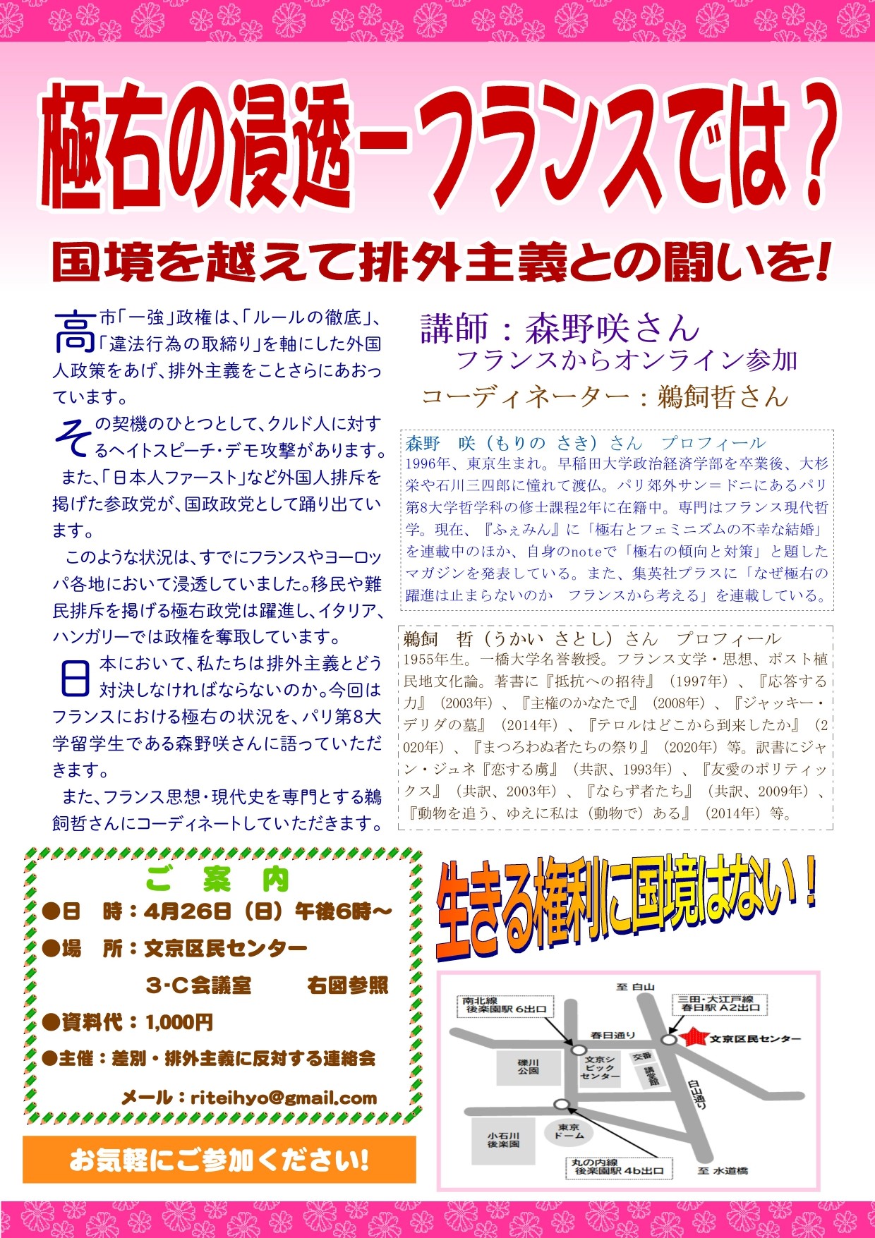 日本において、私たちは排外主義とどう対決しなければならないのか。今回はフランスにおける極右の状況を、パリ第8大学留学生である森野咲さんに語っていただきます。また、フランス思想・現代史を専門とする鵜飼哲さんにコーディネートしていただきます。